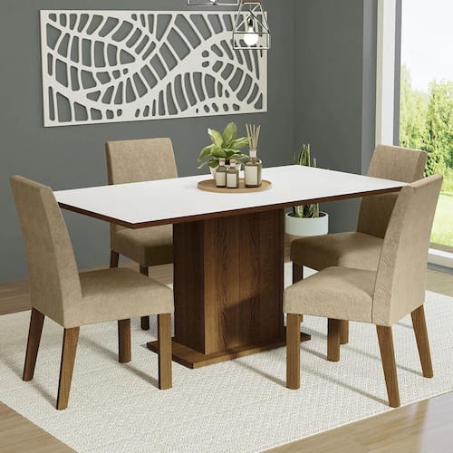 Itens inclusos: - Uma (1) mesa com base pedestal e tampo retangular em MDP - Quatro (4) cadeiras estofadas