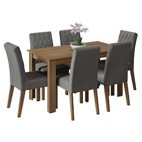 Com o tampo da mesa em madeira e acabamento amadeirado Rustic, ganha ainda mais destaque com seis cadeiras estofadas com tecido Silver, uma escolha moderna e versátil.