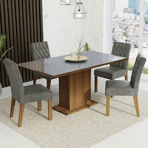 A mesa possui base em pedestal com tom amadeirado clássico. O tampo em MDP possui o topo em pintura cinza e conta com um vidro sobreposto super moderno, que deixa seu ambiente mais clean. Além disso, é seguro e fácil de instalar.