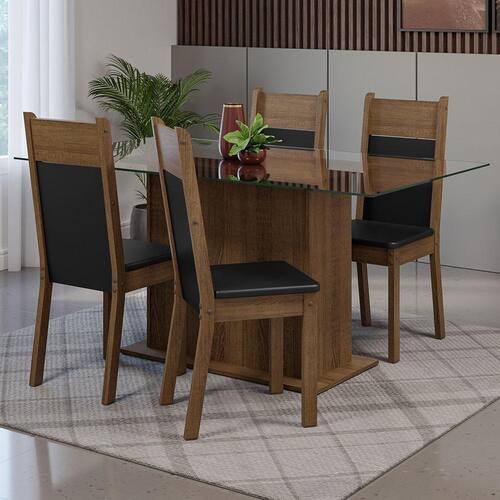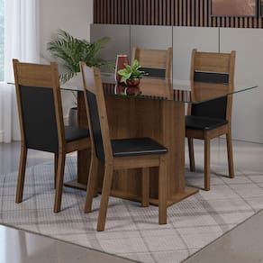 Cadeiras Estofadas: As cadeiras são fabricadas em MDF/MDP, garantindo qualidade e resistência. Além disso, o assento é estofado em material sintético preto, proporcionando um toque de conforto extra.