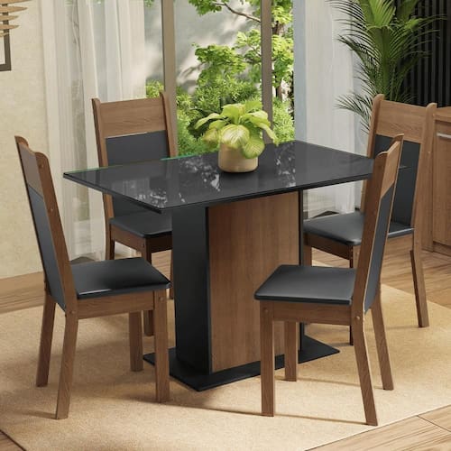 Acabamento em tom amadeirado Rustic com estofado preto sintético para transformar qualquer ambiente. O tampo de vidro da mesa completa o conjunto trazendo um toque de estilo para sua casa.