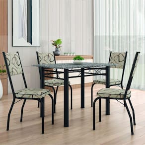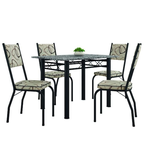 O Conjunto Sala de Jantar Mesa Isis com 4 lugares foi desenvolvido para trazer ainda mais beleza e conforto para o seu lar. Possui tampo retangular em granito resistente a altas temperaturas, e as cadeiras são revestidas em tecido material sintético de fácil limpeza. Ainda conta com base da mesa e cadeiras de aço, garantindo resistência e durabilidade.