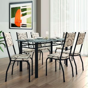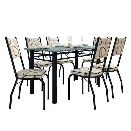O Conjunto Sala de Jantar Mesa Diana com 6 lugares foi desenvolvido para trazer ainda mais beleza e conforto para o seu lar. Possui tampo retangular em granito resistente a altas temperaturas, e as cadeiras são revestidas em tecido material sintético de fácil limpeza. Ainda conta com base da mesa e cadeiras de aço, garantindo resistência e durabilidade.