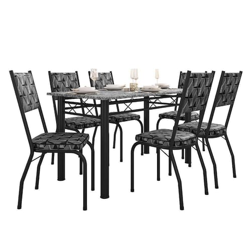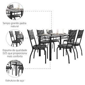O Conjunto Sala de Jantar Mesa Diana com 6 lugares foi desenvolvido para trazer ainda mais beleza e conforto para o seu lar. Possui tampo retangular em granito resistente a altas temperaturas, e as cadeiras são revestidas em tecido material sintético de fácil limpeza. Ainda conta com base da mesa e cadeiras de aço, garantindo resistência e durabilidade.