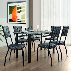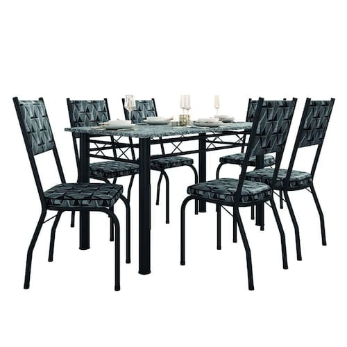 O Conjunto Sala de Jantar Mesa Diana com 6 lugares foi desenvolvido para trazer ainda mais beleza e conforto para o seu lar. Possui tampo retangular em granito resistente a altas temperaturas, e as cadeiras são revestidas em tecido material sintético de fácil limpeza. Ainda conta com base da mesa e cadeiras de aço, garantindo resistência e durabilidade.