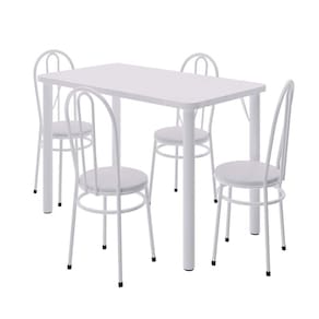 Esse conjunto de sala de jantar Bona Vita, composto de mesa retangular, com tampo branco e 04 cadeiras tubulares revestidas com courino branco era o que faltava para o seu ambiente ficar mais leve e aconchegante. Acabamento da Cadeira/Banco: Pintura Epóxi Acabamento da Mesa: Pintura Epóxi Almofada do assento: Fixa Cadeira/Banco estofada: Sim Cadeira/Banco suporta até: 80 kg calculo: unidade Complexidade da Montagem: Baixa: pode ser montado por uma pessoa sozinha Cr: Enchimento do Assento: Espuma D-18 Escala de Brilho: Fosco Espessura do Tampo: 30 mm Estrutura do Assento: MDP e espuma D18 Formato: Retangular Itens Inclusos: 1 Mesa, 4 Cadeiras e Manual de Montagem. Linha ou Coleção: Roma Manual de Montagem e Instalação: https://cdn2.madeiramadeira.com.br/atributo/bona-vita-moveis/459777-mesas-ref-900-950.pdf Material da Base da Mesa: MDP Material da Estrutura da Cadeira: Aço Material do Tampo: MDP Medida da Cadeira/Banco (A x L x P): 88cm x 36cm x 36cm Medida da Mesa (A x L x P): 79cm x 115cm x 70cm Medida do Tampo (L x C x E): 115cm x 70cm x 3cm Mesa suporta até: 20 kg Necessita Montagem: Sim Origem do Produto: Nacional Peso da Cadeira/Banco: 1,75 kg Peso da Mesa: 9 kg Possui Apoio para Braços: Não Possui Apoio Para os Pés: Não Possui Suporte Giratório: Não Quantidade de Lugares: 04 Recomendações de Uso, Manutenção e Limpeza: Limpar com pano levemente umedecido e não usar produtos abrasiv.os. Revestimento da Cadeira/Banco: Courino Sistema de Montagem: Parafusos. status-cadastro: Aprovado Tamanho: