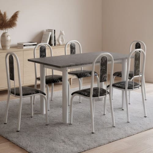 O Conjunto Topázio é ideal para quem busca resistência, elegância e conforto no dia a dia. A mesa retangular possui tampo em granito, trazendo sofisticação e praticidade. Sua base robusta garante firmeza e longa durabilidade. Acompanha 6 cadeiras com estrutura em aço, assentos e encostos estofados em tecido estampado, que proporcionam conforto e estilo ao ambiente. Perfeito para transformar sua sala de jantar ou cozinha em um espaço moderno e acolhedor.