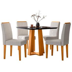 Mesa com estrutura em MDF, vidro colado sobre o tampo e base aberta.