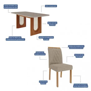 A Mesa Valentina é uma peça de destaque, com base de MDF que oferece estabilidade e um detalhe em tela sintética que agrega textura e elegância. Seu tampo de vidro temperado combina modernidade com segurança. Já a cadeira Juliana une elegância, conforto e funcionalidade, com estrutura de madeira que traz durabilidade e um toque rústico refinado. O assento e encosto estofados garantem conforto, e o sistema de fácil montagem acrescenta praticidade.