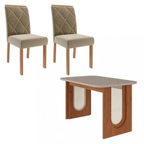 A Mesa Valentina destaca-se pelo design artístico, com base em MDF que garante estabilidade e detalhe em tela sintética, que adiciona elegância e textura. O tampo de vidro temperado traz modernidade, leveza e segurança. A Cadeira Fernanda combina elegância, conforto e funcionalidade, com estrutura de madeira que oferece durabilidade e um toque rústico. Seu estofamento de alta qualidade garante conforto, e seu sistema facilita a montagem.