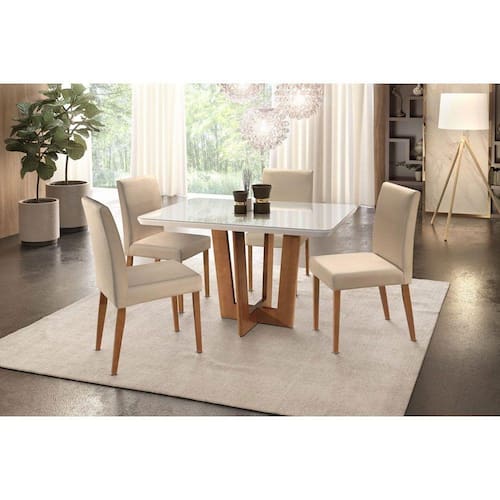01 - BASE DA MESA: EM LÂMINA DE MADEIRA CINAMOMO 01 - Tampo: MDF LAMINADO E VIDRO SERIGRAFADO DE 4 MM 04 - Cadeiras: MADEIRA MACIÇA TAUARI