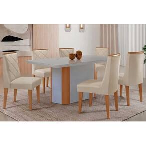 Conjunto Sala de Jantar Pietá c/ Tampo Madeirado c/ Vidro Canto Curvo 180x90cm e 6 Cadeiras Pietá Madeira Maciça Naturale/Off White - Capuccino/Suede - Blush