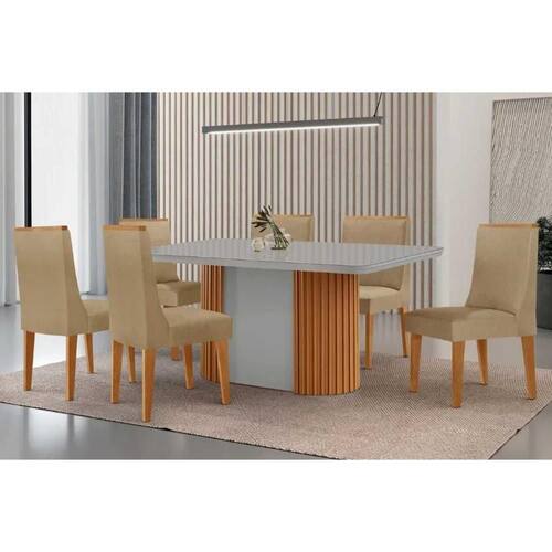 Conjunto Sala de Jantar Pilar c/ Tampo Madeirado c/ Vidro Canto Curvo 180x90cm e 6 Cadeiras Dakota Madeira Maciça Naturale/Off White - Capuccino/Linho - Conjunto de Sala de Jantar