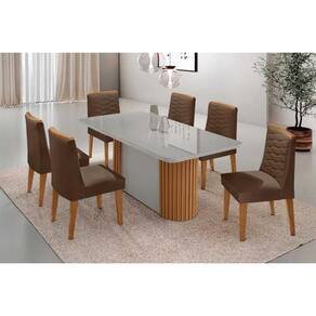 Sala de Jantar Completa Pilar c/ Tampo Madeirado c/ Vidro Canto Curvo 180x90cm e 6 Cadeiras Maldivas Madeira Maciça Naturale/Off White - Capuccino/Suede Marrom - Rufato Abaixo segue os produtos do KIT: Sala de Jantar Completa Pilar c/ Tampo Madeirado c/ Vidro Canto Curvo 180x90cm e 6 Cadeiras Maldivas Madeira Maciça Naturale/Off White - Capuccino/Suede Marrom - Rufato