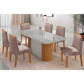 Sala de Jantar Completa Pilar c/ Tampo Madeirado c/ Vidro Canto Curvo 180x90cm e 6 Cadeiras Maldivas Madeira Maciça Naturale/Off White - Capuccino/Suede Creme - Rufato Abaixo segue os produtos do KIT: Sala de Jantar Completa Pilar c/ Tampo Madeirado c/ Vidro Canto Curvo 180x90cm e 6 Cadeiras Maldivas Madeira Maciça Naturale/Off White - Capuccino/Suede Creme - Rufato