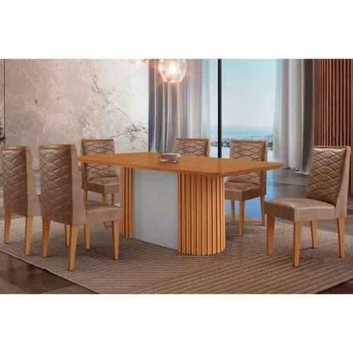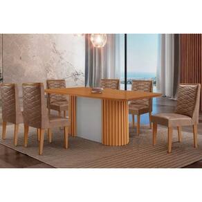Sala de Jantar Completa Pilar c/ Tampo Madeirado Canto Curvo 180x90cm e 6 Cadeiras Dafne Madeira Maciça Naturale/Off White - Capuccino/Corano Capuccino - Rufato