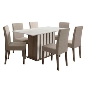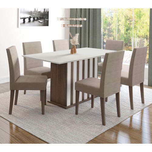 Com design contemporâneo a Mesa de Jantar Amalia com 06 cadeiras é perfeita para completar seu ambiente. Possui base retangular que traz mais robustez com detalhes em chapa de madeira MDP ripada na parte frontal. Tampo retangular160x90cm em MDP 25mm com bordas chanfradas que confere um aspecto mais sofisticado a superfície. Acompanha 06 cadeiras modelo Josi resistentes, ergonomicamente projetadas para proporcionar mais conforto em seus momentos entre amigos e familiares. Cadeiras revestidas em tecido suede aveludado liso que oferece maior suavidade e maciez, pés em MDF 25mm, assentos com espuma densidade D20 que garante uma excelente acomodação. Produtos com sapatas plásticas garantindo melhor durabilidade e estabilidade, acabamento em pintura UV que preserva a coloração além de facilitar na limpeza, ecologicamente corretos com embalagens preparadas cuidadosamente afim de evitar avarias permitindo que os produtos cheguem em perfeito estado em sua casa. Permite a combinação com os mais variados ambientes. Qualidade que só a Poliman oferece em seus produtos.