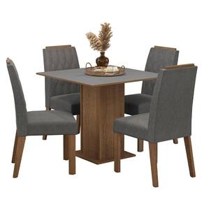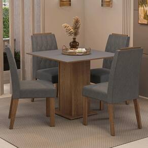 A estrutura da mesa é no acabamento amadeirado Rustic, o tampo em Cinza e as cadeiras revestidas em tecido Suede Silver. O conjunto é ideal para cozinhas ou salas de jantar, garantindo beleza, conforto e praticidade sem ocupar muito espaço.