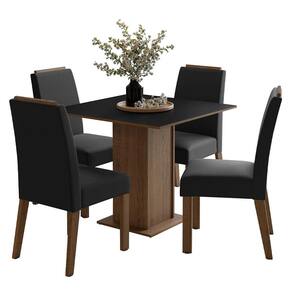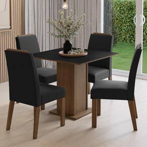 O conjunto inclui quatro cadeiras estofadas com detalhe amadeirado no topo, que trazem elegância e conforto. A mesa quadrada, com base em pedestal e tampo em MDP, proporciona estabilidade e uma superfície prática para o uso diário.