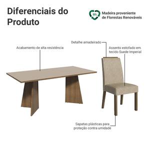 Com seis cadeiras estofadas, cada detalhe, incluindo o acabamento amadeirado no topo, proporciona elegância. A mesa, com base em formato trapézio e tampo em MDP, oferece estabilidade e amplo espaço para acomodar toda a família, tornando cada refeição ainda mais agradável.