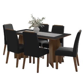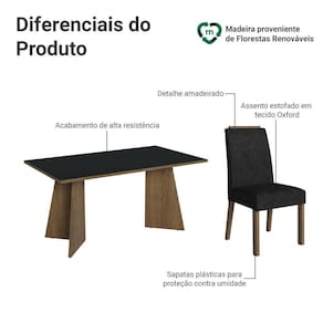 A estrutura da mesa é no acabamento amadeirado Rustic, o tampo em preto e as cadeiras estofadas em tecido Suede Oxford, criam um visual aconchegante. Ideal para quem busca unir beleza, funcionalidade e durabilidade em um único móvel.