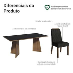 A estrutura da mesa é no acabamento amadeirado Rustic, o tampo em Preto e as cadeiras estofadas em tecido Suede Oxford.A combinação de tons escuros com detalhes amadeirados cria um ambiente sofisticado e acolhedor, tornando o conjunto ideal para unir beleza, conforto e praticidade em sua sala de jantar.