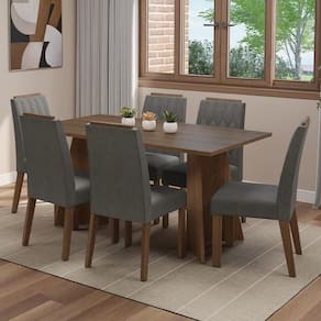 Com seis cadeiras estofadas em tecido Suede Silver, o conjunto oferece o conforto necessário. O amplo espaço da mesa, com acabamento em tom amadeirado Rustic, cria um ambiente moderno. Ideal para quem busca unir beleza, funcionalidade e durabilidade em um único móvel.