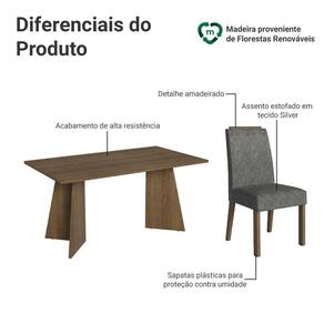A estrutura da mesa é no acabamento amadeirado Rustic, e as cadeiras estofadas em tecido Suede Silver, criando um visual elegante. Ideal para quem busca unir beleza, funcionalidade e durabilidade em um único móvel.