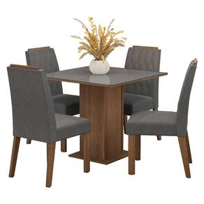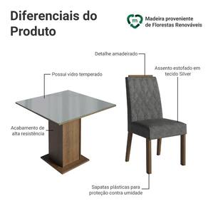 Com quatro cadeiras estofadas, cada detalhe incluindo o acabamento amadeirado no topo, oferece um toque moderno. A mesa quadrada, com base em pedestal e tampo com vidro sobreposto, proporciona estabilidade e espaço suficiente para acomodar refeições do dia a dia, tornando cada momento à mesa mais agradável.