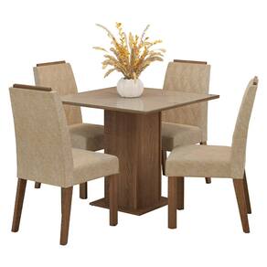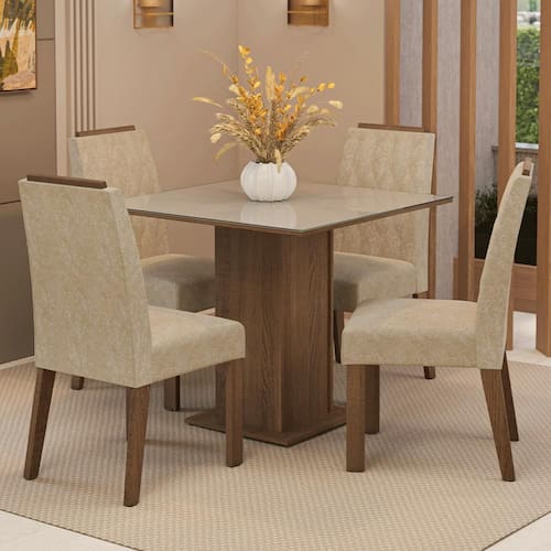 Com quatro cadeiras estofadasl, cada detalhe incluindo o acabamento amadeirado no topo, oferece sofisticação e aconchego. A mesa quadrada, com base em pedestal e tampo com vidro sobreposto, proporciona estabilidade e espaço suficiente para acomodar refeições do dia a dia, tornando cada momento à mesa mais agradável.