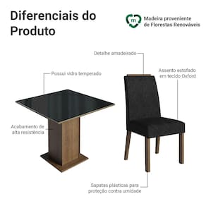 Com estrutura da mesa em tom amadeirado Rustic, tampo preto com vidro sobreposto e cadeiras em tecido Oxford, o conjunto Mendonza combina cores escuras e detalhes amadeirados, criando um ambiente elegante e acolhedor, ideal para unir estilo, conforto e funcionalidade mesmo em espaços compactos.