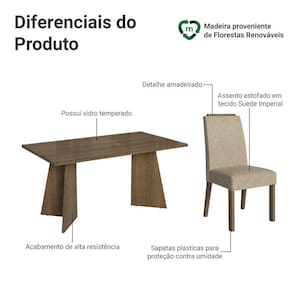 A estrutura da mesa é no acabamento amadeirado Rustic, combinado com as cadeiras estofadas com o tecido Suede Imperial, criam um visual aconchegante. Ideal para quem busca unir beleza, funcionalidade e durabilidade em um único móvel.