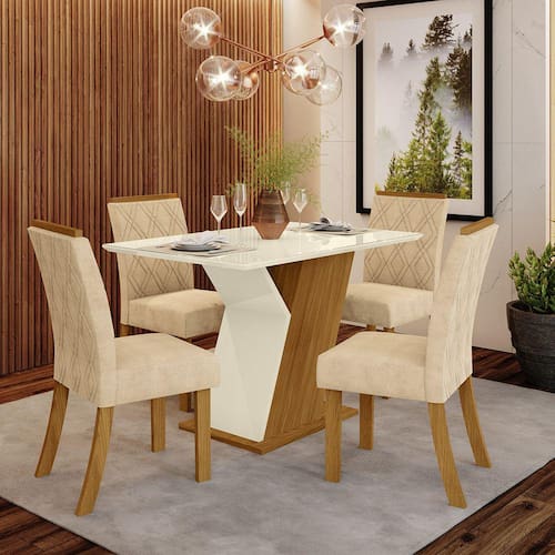 O conjunto Sala de Jantar Lupita foi projetado para proporcionar praticidade e funcionalidade, além de embelezar o ambiente, vai garantir conforto durante suas refeições. A mesa possui tampo de 1.200X800mm canto reto com vidro e conta com 04 cadeiras estofadas.