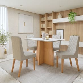 Medida da Mesa (A x L x P): 78cmx120cmx80cm Peso da Mesa: 28,46 kg Mesa suporta até: 50 kg Acabamento da Cadeira/Banco: Pintura Acabamento da Mesa: Pintura UV Acompanha Manual de Instalação: Sim Almofada do assento: Fixa Ambiente Principal: Sala de Jantar Cadeira/Banco estofada: Encosto e Assento Estofados Cadeira/Banco suporta até: 120 kg codigo_ean: 7900288137715 Complexidade da Montagem: Alta: deve ser montado por um montador especializado Cor: Amêndoa Clean/Off White/Bege Cor do Produto: Amêndoa Clean/Off White/Bege Cor Secundária: Bege De Canto (Canto Alemão): Não Enchimento do Assento: Espuma D-20 Enchimento do Encosto: Espuma D-18 Escala de Brilho: Fosco Espessura do Tampo: 18 mm Estrutura do Assento: MDF Estrutura do Encosto: MDF Formato do Tampo: Retangular Itens Inclusos: 1 Mesa, 4 Cadeiras, Manual de Montagem e Kit Ferragens Manual de Montagem e Instalação: https://cdn2.madeiramadeira.com.br/prd/mOveis-lopas/2762040-1742906230-982843-151375.pdf Marca: Móveis Lopas Material da Base da Mesa: MDF/MDP Material da Estrutura da Cadeira: MDF Material do Tampo: MDF Medida da Cadeira/Banco (A x L x P): 97cmx43cmx57cm Medida do Tampo (L x C x E): 120cmx80cmx18mm Mesa Extensível: Não Necessita Montagem: Sim Origem do Produto: Nacional Peso da Cadeira/Banco: 9,3 kg Possui Apoio Para os Pés: Não Possui Vidro: Não Quantidade de Cadeiras: 4 Quantidade de Lugares: 04 Recomendações de Uso, Manutenção e Limpeza: Limpar com flanela limpa e seca. Não usar produtos abrasivos. Revestimento da Cadeira/Banco: Boucle Sistema de Montagem: Parafusos. Tipo de Encosto: Fixo