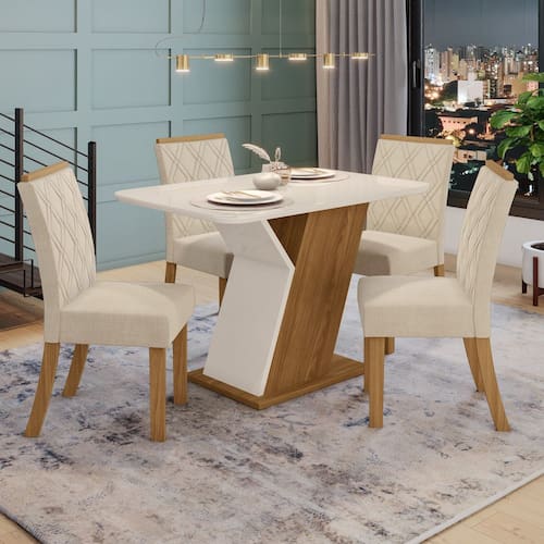 O conjunto Sala de Jantar Lupita foi projetado para proporcionar praticidade e funcionalidade, alem de embelezar o ambiente, vai garantir conforto durante suas refeicoes. A mesa possui tampo de canto Arredondado com vidro e o conjunto conta com 4 cadeiras estofadas.