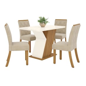 FICHA TECNICA: Escala de Brilho Cadeiras: Fosco Cadeiras Possui Rodizio: Nao Peso Suportado por Cadeira: 120 Kg Estrutura Assento: MDP/MDF Altura Assento ate o chao: 45,5 Cm Revestimento Assento: Veludo Enchimento Assento: Espuma D23 Almofada Assento: Fixa Tipo Assento: Fixa Estrutura Encosto: MDP/MDF Revestimento Encosto: Veludo Enchimento Encosto: Espuma D18 Tipo Encosto: Fixo Material dos pes: MDP Medidas por Cadeiras Montada -A x L x P-: 95 x 44 x 57,5 Cm Peso por Cadeira Montada: 7,5 Kg Acabamento Base Mesa: Pintura UV Texturizada no Nature e Pintura UV no Off White Acabamento Tampo Mesa: Pintura UV Escala Brilho Tampo Mesa: Brilho Escala Brilho Base Mesa: Fosco Material Base Mesa: MDP Material Principal Mesa: MDP/MDF Mesa Suporta Ate: 40 Kg Mesa Extensivel: Nao Formato Tampo: Retangular arredondado Material Tampo: MDF Medida Tampo -L x C x E-: 80 x 120 x 2,5 Cm Possui Vidro: Sim Vidro Temperado: Nao Tamanho Vidro -L x C x E-: 80 x 120 x 0,4 Cm Medidas Mesa Montada -A x L x P-: 80 x 80 x 120 Cm Peso Mesa Montada: 39 Kg