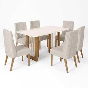 Dê um toque de sofisticação ao ambiente com o conjunto de mesa Michelle. A mesa possui tampo em MDF com vidro, e o conjunto conta com 6 cadeiras estofadas, garantindo conforto para seus convidados durante as refeições. Além disso, o design moderno e elegante da Michelle combina facilmente com diferentes estilos de decoração, deixando a sua sala de jantar ainda mais charmosa. Aposte na qualidade e beleza desse conjunto e torne seus momentos à mesa ainda mais especiais! Medida da Mesa (A x L x P): 80 x 160 x 90 Cm Peso da Mesa: 56 Mesa suporta até: 40 Acabamento da Cadeira/Banco: Pintura Texturizada Acabamento da Mesa: Pintura Texturizada Almofada do assento: Fixa Altura do Conjunto: 80 Ambiente Principal: Sala de Jantar Cadeira/Banco estofada: Encosto e Assento Estofados Cadeira/Banco suporta até: 120 Complexidade da Montagem: Alta: deve ser montado por um montador especializado Cor: Marrom/Off White/Linho Cor do Produto: Marrom/Off White/Linho Cor Secundária: Marrom De Canto (Canto Alemão): Não Enchimento do Assento: Espuma D-23 Enchimento do Encosto: Espuma D-15 Escala de Brilho: Fosco Espessura do Tampo: 29 Espessura do Vidro: mm Estrutura do Assento: MDP/MDF Estrutura do Encosto: MDF/MDP Formato do Tampo: Retangular Informações Complementares: • Tampo com Acabamento em usinagem negativa; • Borda Arredondada com Pintura Laqueada que garante mais Resistência e durabilidade; • Vidro com pintura em Off White e canto arredondado acompanhando o acabamento do Tampo; Itens Inclusos: 1 Mesa, 6 Cadeiras, Kit Ferragens, Manual de Monagem Linha ou Coleção: Michelle Manual de Montagem e Instalação: https://cdn2.madeiramadeira.com.br/atributo/henn-sala-de-jantar/1336389-se564-conj-sala-jantar-michelle-8ca-ct-arre-c-vid.pdf Material da Base da Mesa: MDP Material da Estrutura da Cadeira: MDF/MDP Material do Tampo: Vidro/MDF Medida da Cadeira/Banco (A x L x P): 97 x 47 x 64 Cm Medida do Tampo (L x C x E): 90 x 160 x 2,9 Cm Mesa Extensível: Não Necessita Montagem: Sim Origem do Produto: Nacional Peso da Cadeira/Banco: 9 Possui Apoio para Braços: Não Possui Apoio Para os Pés: Não Possui Suporte Giratório: Não Quantidade de Lugares: 06 Recomendações de Uso, Manutenção e Limpeza: Para limpeza de seu móvel, use uma flanela seca ou umedecida. Não utilize produtos químicos que possam danificar o produto. Revestimento da Cadeira/Banco: Linho Sistema de Montagem: Parafusos e Cavilhas Vidro Temperado: Não