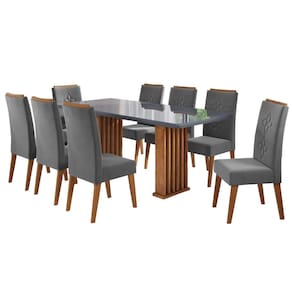 - Material da Estrutura: Mdp, Mdf, Eucalipto - Espessura da Estrutura: 21 mm, 25 mm, 40 mm - Possui Gavetas?: Não - Possui Portas?: Não - Possui Espelho?: Não - Possui Prateleiras?: Não - Possui Puxadores?: Não - Linha ou Coleção: Casa Giulia - Escala de Brilho: Semi-Brilho - Possui Tampo?: Sim - Material do Tampo: Vidro e MDF - Espessura do Tampo (mm): 44 mm - Possui Rodízios?: Não - Possui Sapatas?: Sim - Quantidade de Sapatas: 40 - Possui Pés?: Sim - Quantidade de Pés: 32 - Pés com regulagem de altura?: Não - Possui Borda de PVC nas Bordas?: Não - Grau de Dificuldade de Montagem: Médio - Necessita de Montagem: Sim - Sistema de Montagem: Parafusos, cavilhas - Pode Ser Montado Invertido?: Não - Como os Móveis Chegarão em Minha Casa?: Desmontado em caixas, acompanhado de todas as peças, ferragens e manuais para montagem. - Acompanha: manual de montagem e kit ferragem - Categoria: Mesa de Jantar 8 Lugares - Indicação de Uso: Sala de Jantar - Garantia (dias): 90 Dias - Observação: Objetos decorativos que aparecem nas imagens, não acompanham o produto. - Recomendação de Manutenção: Utilizar pano levemente umedecido, seguido de pano seco. Não utilizar quaisquer produtos abrasivos. - Revestimento/Acabamento: Pintura UV e Veludo - Cadeira Estofada: Sim - Material do Assento: Mdf e Madeira - Acompanha Cadeiras: Sim - Densidade do Assento: D-26 - Formato da Mesa: Retangular - Quantidade de Lugares: 8 Lugares - Material do Encosto: Mdf e Madeira - Densidade do Encosto: D-12 - Material do Tampo: Vidro/MDF - Tecido da Cadeira: Veludo - Peso Suportado no Tampo: 50 kg - Altura do Chão até o Assento (cm): 485 - Possui Vidro: Sim - Medidas da Cadeira ( A x L x P ): A:98,5 x L:41 x P:61cm - Vidro Temperado: Sim - Peso Suportado: 90 kg - Quantidade de cadeiras por conjunto: 8