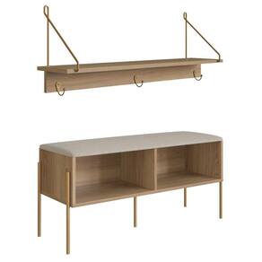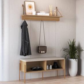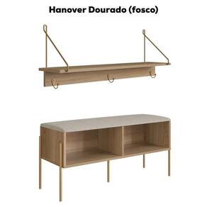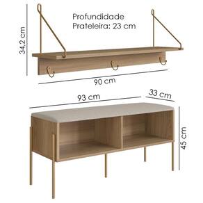 Conjunto Sapateira Banco e Prateleira 28979, ideal para transformar qualquer espaço com sofisticação. Produzido em MDP 15 mm com acabamento BP, pés, ganchos e suporte em aço com pintura epóxi dourada. O banco conta com assento em MDP estofado com espuma D26 e revestimento em tecido linho (polipropileno). Possui nichos funcionais e ponteiras plásticas que evitam atrito com o piso. Perfeito para halls de entrada, recepções, salas e outros ambientes. Produto entregue em 3 volumes.