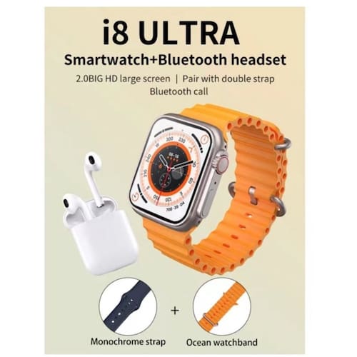 Modelo: plataforma i8 Ultra\ nCompatível: para iOS/Android Medida métrica: monitor de frequência cardíaca, monitor de oxigênio no sangue, monitor de sono, monitor de pressão arterial\ nRastreamento de atividades: rastreador de passos, rastreador de atividades\ nIdioma: inglês, russo, espanhol, polonês, português, turco, italiano, francês, alemão, holandês, função: pasômetro, monitor de sono, lembrete de mensagem, lembrete de chamada, chamada de atendimento, chamada telefônica, instrução de 24 horas, Despertador, hora mundial, semana, mês, monitor de frequência cardíaca\ n\ nCategoria: relógios inteligentes\ nTamanho da tela: 2,0 polegadas”\ nPeso do produto: 213 g destacável banda: Material da caixa: liga\ nMaterial da pulseira:\ nGel de sílica\ nGrau à prova d'água: à prova de água IP67 life\ nCartão SIM disponível:\ nCapacidade da bateria: 120-180 mAh RAM: ROM: Assistente de voz embutido:\ nCompatível com Bluetooth\ nVersão: 5.0\ nMemória: 512 KB + 16 M\ nEstilo de uso: Pulsador Modo de operação: Botão Touch +\ nPorta de carregamento: Magnética Tipo de comunicação: Carregamento não inserido Método: carregamento sem fio\ nMétodo de conexão: Bluetooth\ nOrigem: China\ nMultidão: mulheres, homens, crianças, público, adolescentes, casais Lista de embalagem: relógio inteligente * 1 fone de ouvido Bluetooth * 1 relógio Banda * 2 carregador sem fio * 1 cabo de carregamento* 1