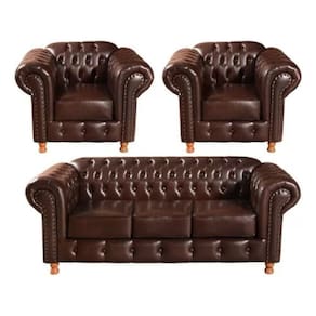 Conjunto Sofá 3 Lugares e 2 Poltrona Chesterfield Luís XV Vintage Retrô Capitonê Couro Marrom