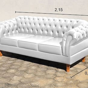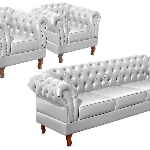 A entrega é realizada no térreo. Produto Montado: Sim Acompanha Almofadas extras: Não Almofada do assento: Removível Almofada do encosto: Não Possui Altura do assento até o chão: 41.0000 Altura do Encosto: 82 cm Ambiente Principal: Sala de Estar codigo_ean: 7909903691779 Complexidade da Montagem: Baixa: pode ser montado por uma pessoa sozinha Cor: Branco Cor do Produto: Branco Densidade do Assento: D-26 Enchimento do Assento: Espuma Estilo de Braço: Braços Redondos Firmeza do Assento: Macio Informações Complementares: 120Kg por acento Itens Inclusos: 1 Sofá 3 Lugares + 2 Poltronas (incluindo seus respectivos pés apenas pra enroscar) Linha ou Coleção: Chesterfield Necessita Montagem: Sim Origem do Produto: Nacional Peso: 75 kg Pet Friendly: Não Possui Percintas Elásticas: Sim Possui Pés: 04 Possui Rodízio: Não Quantidade de Itens: 3 Recomendações de Uso, Manutenção e Limpeza: Limpeza e cuidados: pode ser utilizado aspirador de pó, escova com cerdas macias ou limpeza a seco. Não utilizar produtos químicos, abrasivos ou limpeza a vapor. Evitar exposição prolongada ao sol. Sistema de Montagem: Enroscar os Pés Suporta Até (kg): 120 kg Tecido Predominante: Couro Sintético Tipo de Encosto: Fixo Tipo de Mola: Não Possui