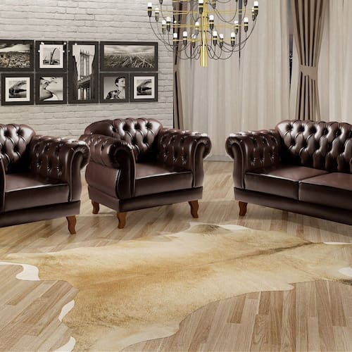 A entrega é realizada no térreo. Produto Montado: Sim Acompanha Almofadas extras: Não Almofada do assento: Removível Almofada do encosto: Não Possui Altura do assento até o chão: 0.0000 Altura do Encosto: 82 cm Ambiente Principal: Sala de Estar codigo_ean: 7909903848517 Complexidade da Montagem: Baixa: pode ser montado por uma pessoa sozinha Cor: Café Cor do Produto: Café Estilo de Braço: Braços Redondos Informações Complementares: 120Kg por acento Itens Inclusos: 1 Sofá 3 Lugares + 2 Poltronas (incluindo seus respectivos pés apenas pra enroscar) Linha ou Coleção: Chesterfield Necessita Montagem: Sim Origem do Produto: Nacional Peso: 32 kg Pet Friendly: Não Possui Percintas Elásticas: Sim Possui Pés: 04 Possui Rodízio: Não Quantidade de Itens: 3 Recomendações de Uso, Manutenção e Limpeza: Limpeza e cuidados: pode ser utilizado aspirador de pó, escova com cerdas macias ou limpeza a seco. Não utilizar produtos químicos, abrasivos ou limpeza a vapor. Evitar exposição prolongada ao sol. Sistema de Montagem: Enroscar os Pés Suporta Até (kg): 120 kg Tecido Predominante: Couro Sintético Tipo de Encosto: Fixo Tipo de Mola: Molas Ensacadas (Molas ensacadas)