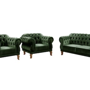 A entrega é realizada no térreo. Produto Montado: Sim Acompanha Almofadas extras: Não Almofada do assento: Removível Almofada do encosto: Não Possui Altura do assento até o chão: 0.0000 Altura do Encosto: 82 cm Ambiente Principal: Sala de Estar codigo_ean: 7909903850398 Complexidade da Montagem: Baixa: pode ser montado por uma pessoa sozinha Cor: Verde Cor do Produto: Verde Estilo de Braço: Braços Redondos Informações Complementares: 120Kg por acento Itens Inclusos: 1 Sofá 3 Lugares + 2 Poltronas (incluindo seus respectivos pés apenas pra enroscar) Linha ou Coleção: Chesterfield Necessita Montagem: Sim Origem do Produto: Nacional Peso: 32 kg Pet Friendly: Não Possui Percintas Elásticas: Sim Possui Pés: 04 Possui Rodízio: Não Quantidade de Itens: 3 Recomendações de Uso, Manutenção e Limpeza: Limpeza e cuidados: pode ser utilizado aspirador de pó, escova com cerdas macias ou limpeza a seco. Não utilizar produtos químicos, abrasivos ou limpeza a vapor. Evitar exposição prolongada ao sol. Sistema de Montagem: Enroscar os Pés Suporta Até (kg): 120 kg Tecido Predominante: Veludo Tipo de Encosto: Fixo Tipo de Mola: Molas Ensacadas (Molas ensacadas)