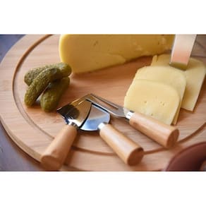 Tábua com talheres para queijo. Sensacional e lindo conjunto. Feita em bambu prensado. Ecologicamente correto. Muito mais leve que outros tipos de madeira. É antibacteriana. Contem 1 tábua e 4 talheres. Medida de 30x30x1,5cm. Os talheres medem 12cm. Você causará inveja nos seus amigos/familiares ao utilizar este conjunto tomando seu vinho. Você não pode ficar sem essa peça.