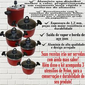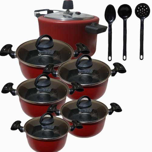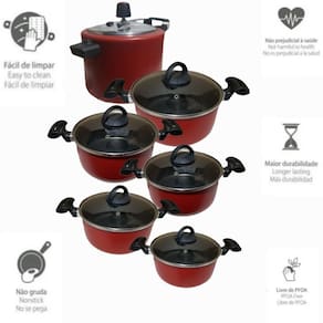 01 Panela Caçarola N24: Diâmetro de 24 cm 01 Panela Caçarola N22: Diâmetro de 22 cm 01 Panela Caçarola N20: Diâmetro de 20 cm 01 Panela Caçarola N18: Diâmetro de 18 cm 01 Panela Caçarola N17: Diâmetro de 17 cm 01 Panela Pressão Antiaderente 4,5 Litros 03 Espátulas de Nylon