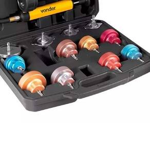 O conjunto é composto por uma maleta plástica resistente, 12 adaptadores universais, uma bomba manual de pressão com manômetro de fácil leitura, uma mangueira flexível com engate rápido e um termômetro analógico de vareta para medições precisas.