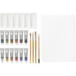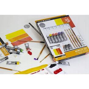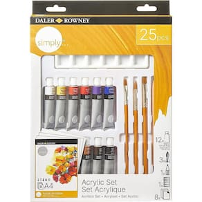 O conjunto Daler Rowney simply® inclui 25 peças para dar asas á sua imaginação com materiais de elevada qualidade. Caso seja experiente ou esteja apenas agora a dar os primeiros passos, este conjunto é para si. Contém 12 tubos de tinta acrílica, 3 pincéis, um lápis e 8 folhas A4 para acrílico.