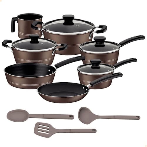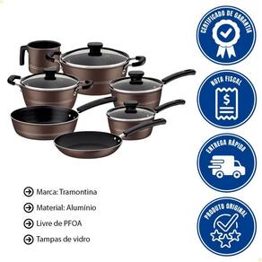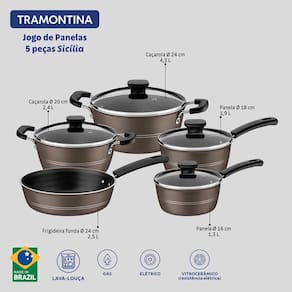 - O jogo de panelas Tramontina Sicília em alumínio com revestimento interno e externo antiaderente Starflon Excellent avelã 5 peças vai garantir uma cozinha equipada com utensílios de alta qualidade e eficiência!