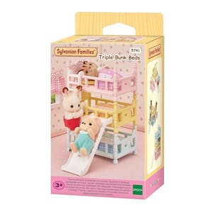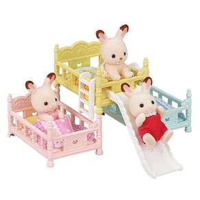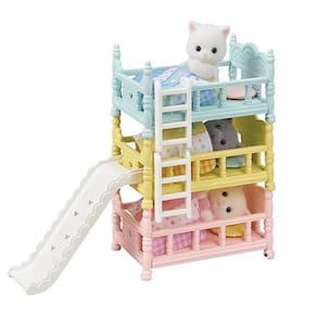Conjunto de móveis com três beliches para bebês com escadas e escorregador. As camas podem ser colocadas umas em cima das outras, uma ao lado da outra e em diversas outras disposições. Inclui travesseiros e edredons combinando em lindas cores pastel. O escorregador e as escadas podem ser fixados nas extremidades ou laterais das camas. Combine com outras figuras, casas e móveis (vendidos separadamente) para brincadeiras ainda mais divertidas e imaginativas.